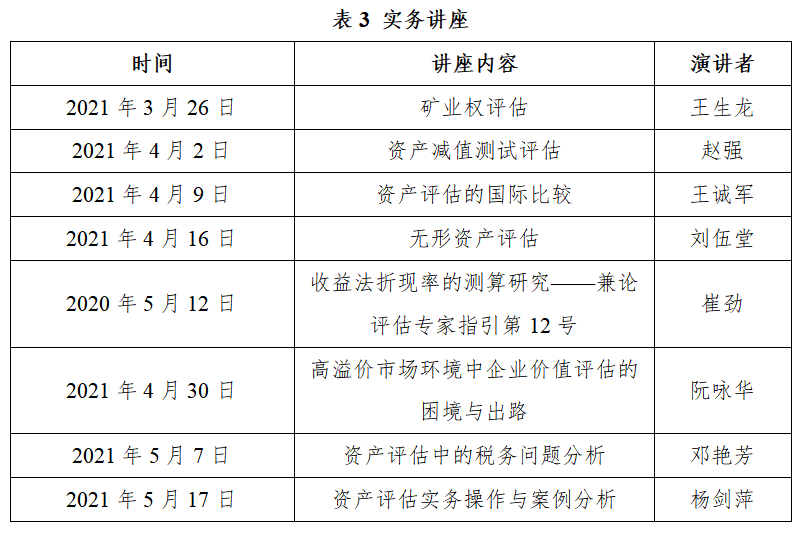 2020年9月到2021年8月,本学位点举办“资产评估大讲堂”讲座8场,邀请实务界多位专家进行授讲,演讲内容涵盖了实务案例、政策分析、理论解析等内容,如表3所示。