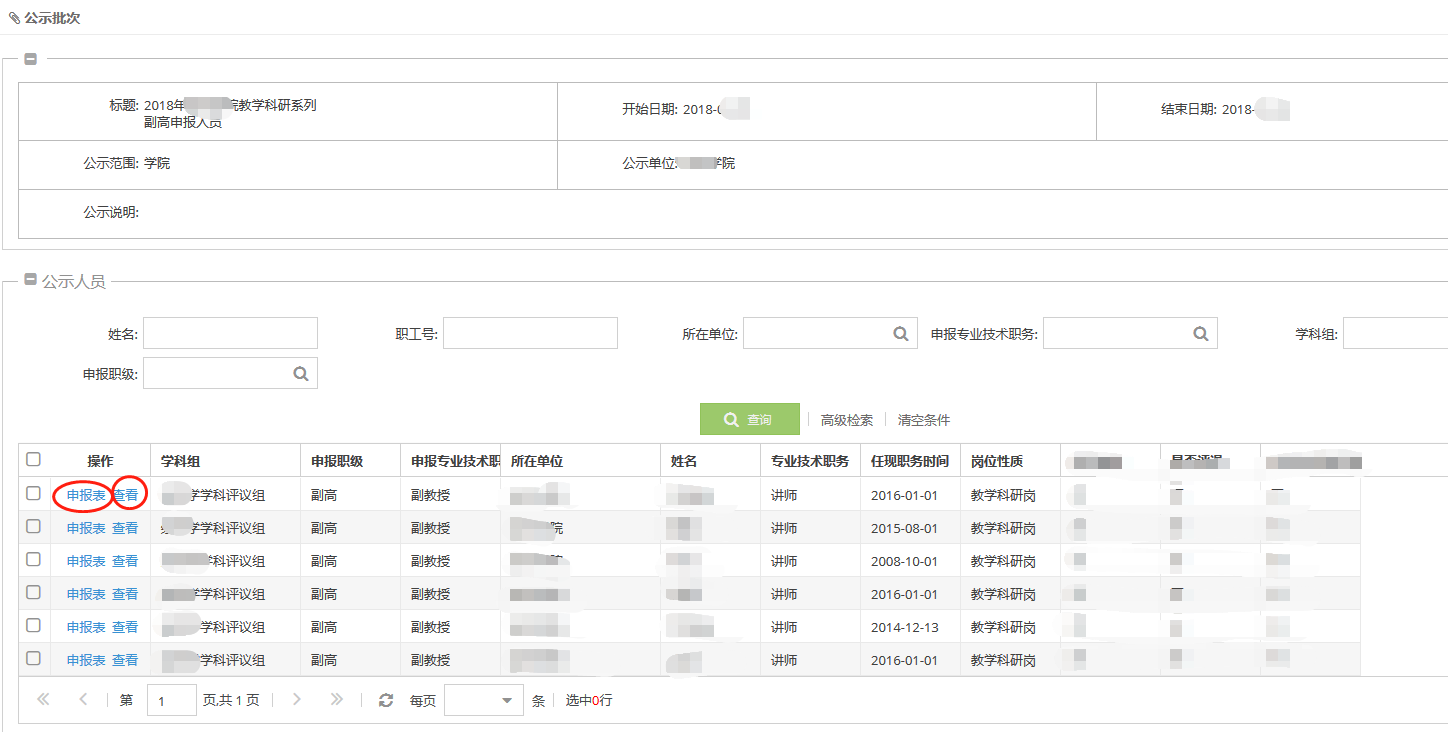 (3)查看公示人员列表,并可通过点击“申报表”或“查看按钮”查看申报人员详细信息。