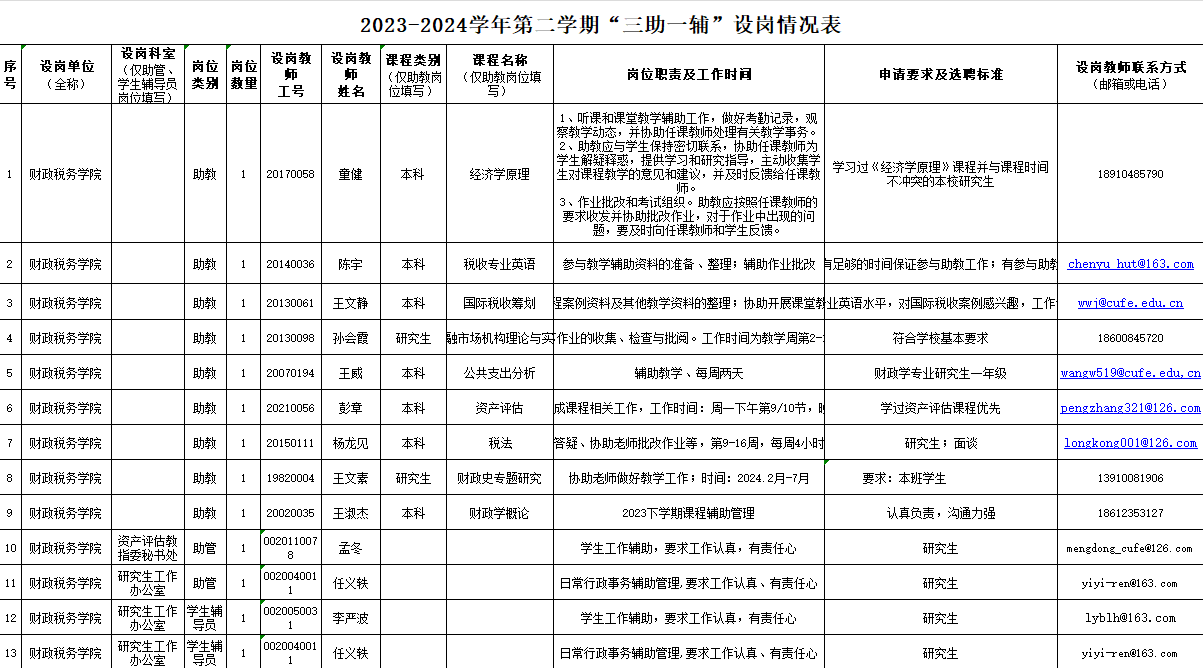 下表是betway西汉姆联平台2023-2024学年第二学期“三助一辅”设岗情况,请有意向申报的研究生根据公布的联系方式自行联系设岗教师,设岗老师在3月12日前完成选聘工作。