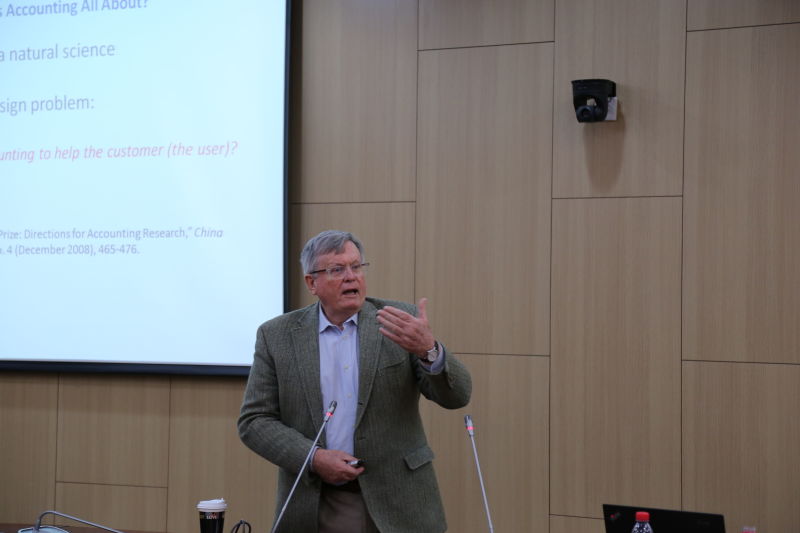本次讲座主要阐释了如何做一篇好的学术研究。Penman教授从如何找到好的研究问题和如何解决好这些问题两方面入手,首先提出了学术研究的一些基本原则和目前会计研究的热点领域,并希望年轻学者们能够加深对理论领域的研究,看好理论研究的未来发展。接着,教授将研究问题分为“Fantasy research”、“DOA(Appealing questions, but Dead On Arrival)”和“Concrete questions”三类,并且对每种类型的研究进行举例说明。Penman教授认为好的研究问题应当是“Concrete questions”,既具有较强的研究意义,又有较强的研究可行性。在选择一个好的研究问题之后,Penman教授认为还要进一步关注如何解决好研究问题,并提出了一系列需要注意的问题。例如,不能简单的对某些变量标签化,在数据转换过程中要格外慎重,关注转换对结果可能产生的影响,注意研究的内生性和外延性问题等。Penman教授指出,做实证研究不能根据统计结果作出结论,统计结果只是我们研究的证据之一。最后,教授希望青年学者们在做研究时要不忘初心,不要盲目“从众”。在讲座进行当中,Penman教授非常幽默的和听众进行互动,使整个讲座丰富有趣,在座师生都颇有收获。历时两个多小时的学术讲座在公司师生们热烈的掌声中圆满结束。讲座结束之后, Penman教授还与公司教师、博士生进行研究方法和研究方向的详细沟通与交流。