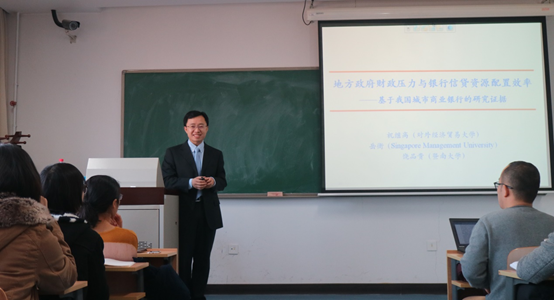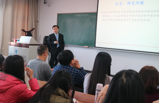 祝继高教授与大家分享了他近来的研究成果之一“地方政府财政压力与银行信贷资源配置效率—基于我国城市商业银行的研究证据”。祝老师首先向大家简要介绍了我国的金融体系、城市商业银行的特点以及城商行与地方政府的联系,然后引出了这篇研究的主要背景及研究发现,分析了地方政府财政压力对于信贷资源的提供者——商业银行的信贷行为和绩效的影响。