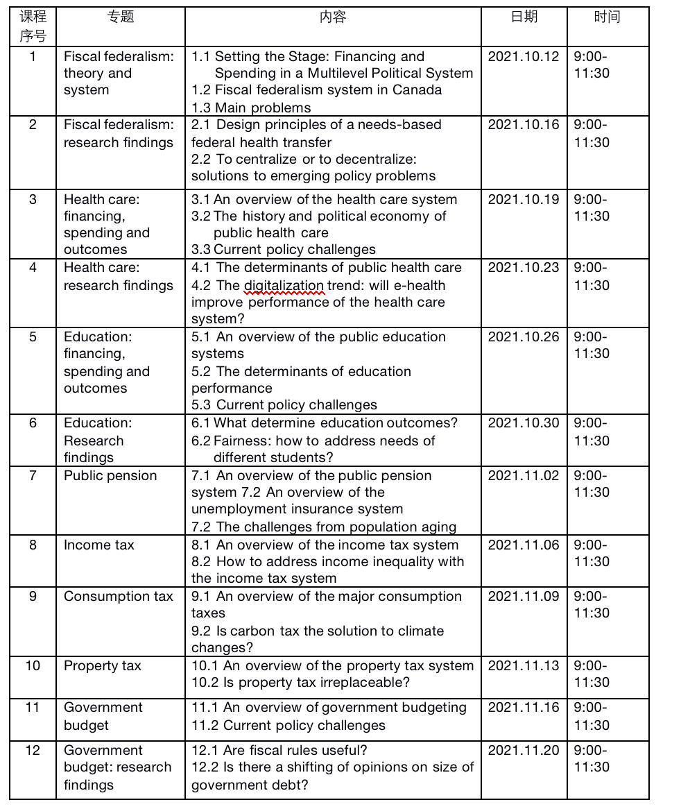 4. 授课内容: 介绍加拿大主要的公共财政支出项目,包括加拿大公费医疗体系、公共教育体系、公共养老金和失业保险政策的设计原理、筹资、分配及其政治经济学影响。介绍加拿大的主要税收体系的设计原理和架构,包括个人所得税,消费税,和房产税。 课程内容还包括政府预算的原理和实践,以及中央、省(保留地)和地方三级政府间的财政转移支付和公共政策决策协调。本课程还会针对几个与公共财政相关的政策问题,用经济学、政治学理论提供分析,并且结合国际经验讨论未来应如何完善政策方案。