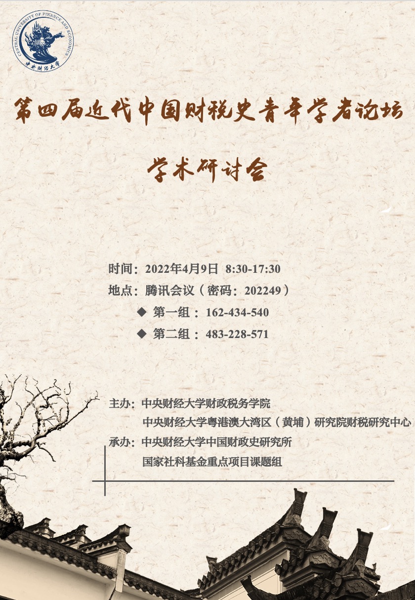主持人:张秀丽 1、田牛:清末新政时期纸币滥发与物价波动 2、江家欣:近代海关税务司的设立与中外贸易管理秩序的变动 3、刘方玮 刘晓泉:李先念央地财权划分思想研究 4、刘巍:西学中用:熊希龄财政思想与实践研究 本组评论人:倪玉平 付志宇 |