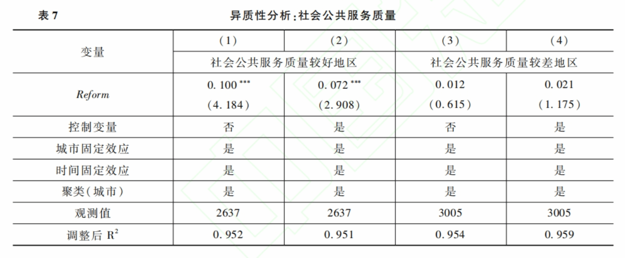 本文从社会公共服务质量、地区政府财政压力水平两个角度进行异质性分析。