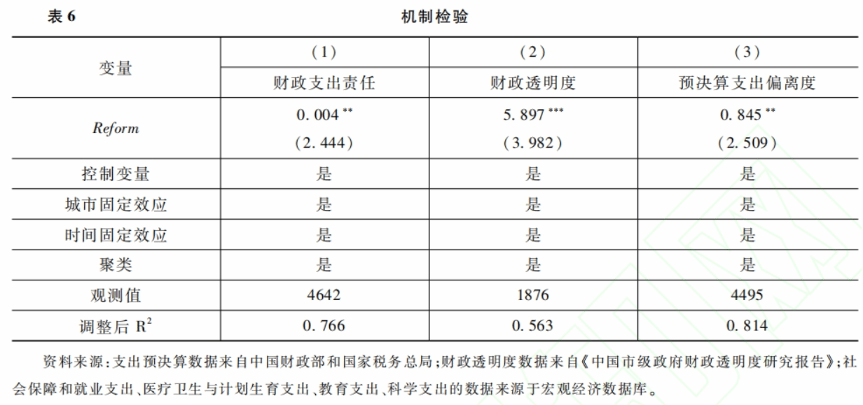 表6报告了机制检验结果,第(1)列表明预算绩效管理改革可以显著提升政府的责任意识;第(2)列表明预算绩效管理改革有助于提高地方政府的公信力;第(3)列表明预算绩效管理改革有助于提高地方政府的执行力。因此,假设H1、H2、H3均成立。