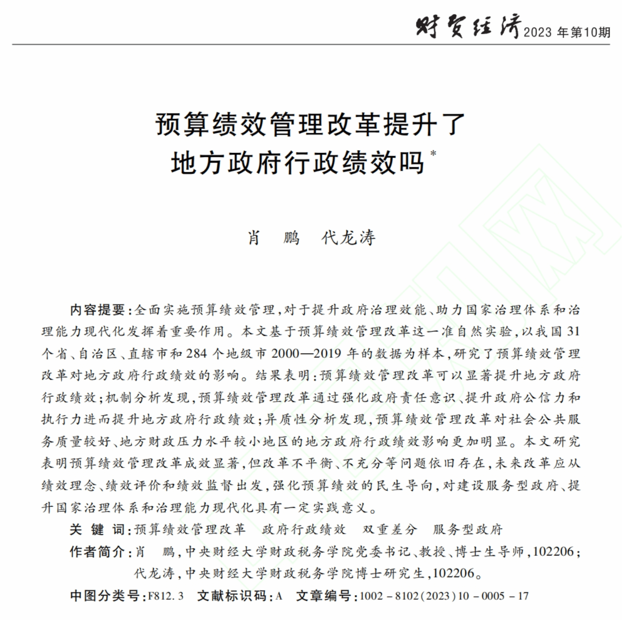 近日,由betway西汉姆联平台肖鹏教授和代龙涛博士撰写的论文《预算绩效管理改革提升了地方政府行政绩效吗》在中文A类期刊《财贸经济》2023年第10期作为封面文章刊发。以下为文章主要内容: