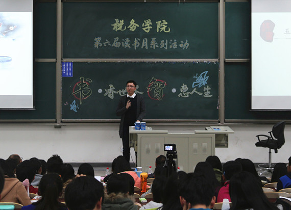 汤贡亮教授致为第六届读书月系列活动开幕式致辞,指导同学们读万卷书,行万里路。随后,李炎老师致辞,表达了对历届读书月活动的高度肯定和对本届活动的期望。刘家豪老师也同样表达了对此系列活动开幕的祝贺和对同学们用心读书的殷切希望。随后,主持人向大家介绍了老师们向同学们推荐的书籍,这其中,既有专业书籍,又有文学名著,种类多样,涉猎广泛。开幕式还邀请了国税14级的王鹏同学与在场的同学们分享自己的读书心得,他指出读书的目的——“永不沦落为精神世界的卑微者”。最后,宋立岩老师总结致辞,指导同学们应多读书、读好书、好读书,用知识武装头脑,用知识点亮生命。老师们的致辞和同学的分享蕴含哲理又不失生动活泼,让在座的每个人获益匪浅。
