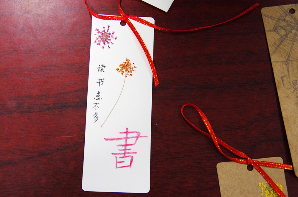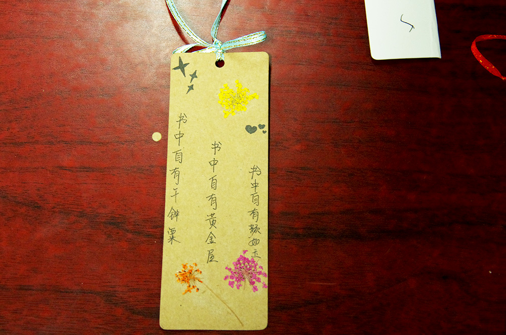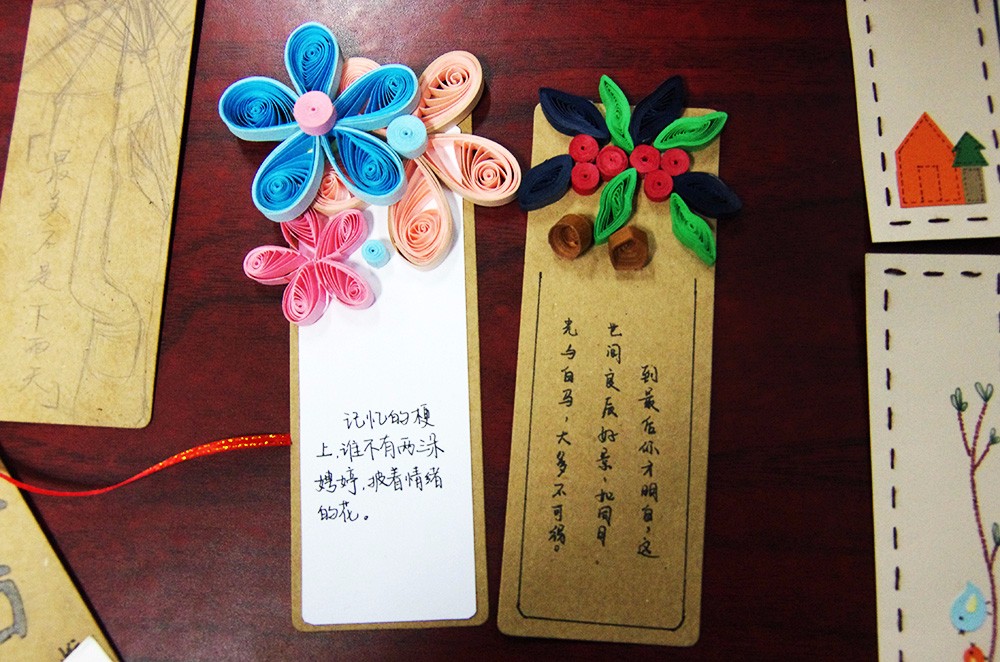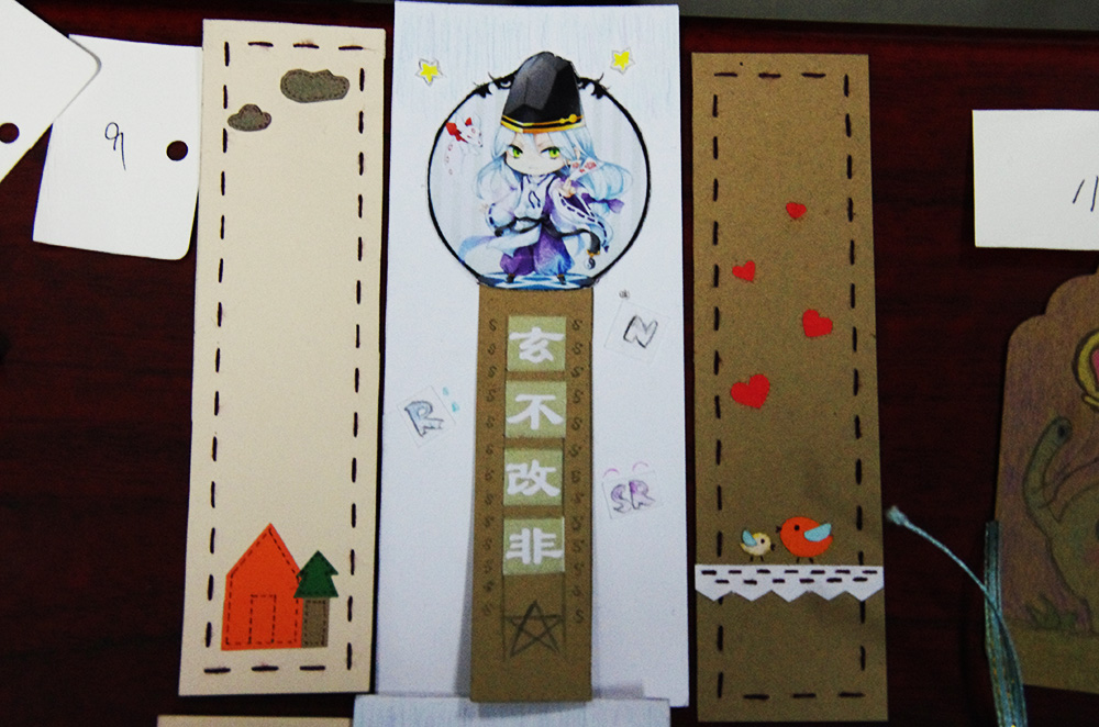 参赛选手们充分利用提供的缎带、贴纸、彩铅以及剪刀、胶棒,结合一些自备的材料,使原本空空如也的空白书签变得精致、文艺气息实足。有的书签简洁大方,令人眼前一亮;有的则构图精巧,使人拍案称奇。在设计和制作书签的过程中,同学们充分的展示了自己丰富的想象力和强大的动手能力。