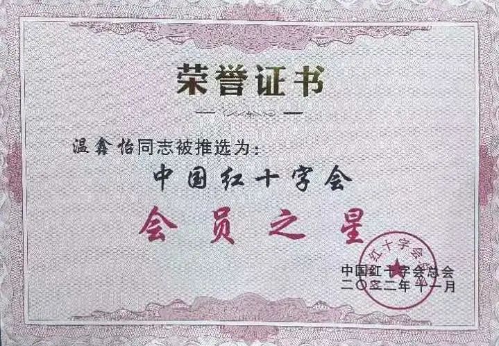 公司温鑫怡同学被评为其中一位“会员之星”,是公司红会首次有成员获得此荣誉,为公司的红十字事业起到带头作用。