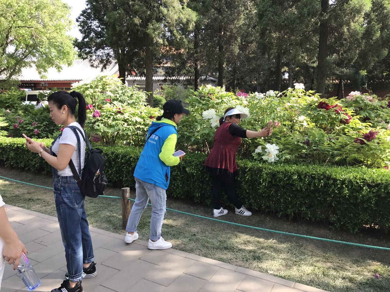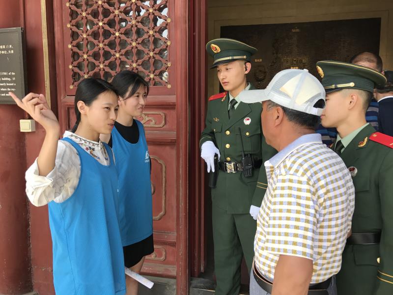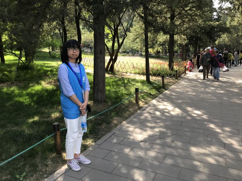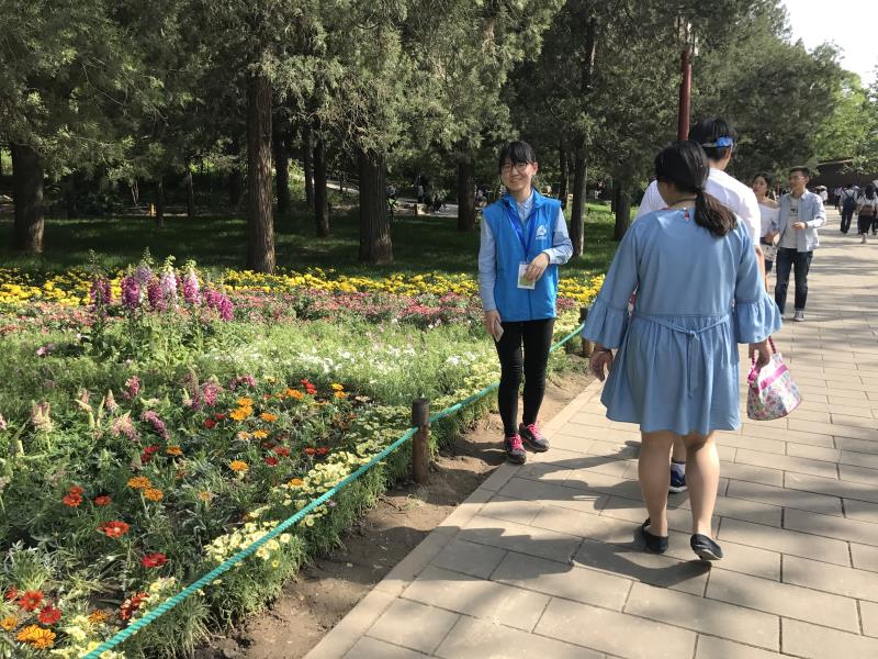 在接近一个半小时的车程后,志愿者们到达了景山,公园志愿负责人热情地接待了志愿者并对同学们表达了感谢和赞赏。随后,在公园志愿负责人介绍基本情况、岗位情况、分组安排和注意事项后,第一队的五名同学率先上岗,带着扩音器和志愿牌到达指定地点。除了定点计数,这次志愿还有护花保洁的任务,即将不文明的观花行为扼杀在摇篮里。志愿者们在自己的护花区域内来回穿梭,时刻关注游客的动态。志愿途中,不少游客在志愿者的劝阻之下及时收手,让花朵儿和小草免受伤害。