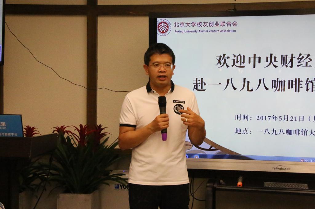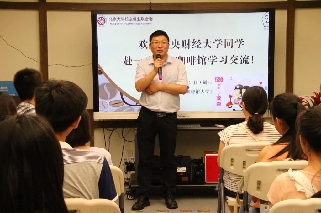 上半场的活动由北京大学员工创业联合会执行秘书长蔡润维先生主持,他首先对咖啡馆进行了简要的介绍。1898咖啡馆于2013年依托北京大学员工创业联合会创建,是国内首家员工创办的公司,开创了中国式众筹的新模式。而后有三位咖啡馆的股东上台发言。文钊先生介绍了创建咖啡馆的历程和中国式众筹的发源,并分析了中国式众筹的特色。基于中国社会人们普遍对陌生人缺乏信任的特点,国外的众筹模式在中国寸步难行,而北大员工开创的中国式众筹模式从小圈子做起,便摆脱了这个困境,并取得辉煌成就。关于老员工创业,他指出老员工应当先学好专业知识,全面提升自身的能力后再去创业。章叶飞女士结合自己的工作经历给大家提出了创业建议,鼓励同学们在学习的同时接触社会,开阔视野。陆德忠先生介绍了自己创建甘肃1898咖啡馆的过程,并结合自己担任大创评委的经历分析了老员工创业的特点,他建议同学们在创业的过程中侧重对市场的调查和可行性的分析。