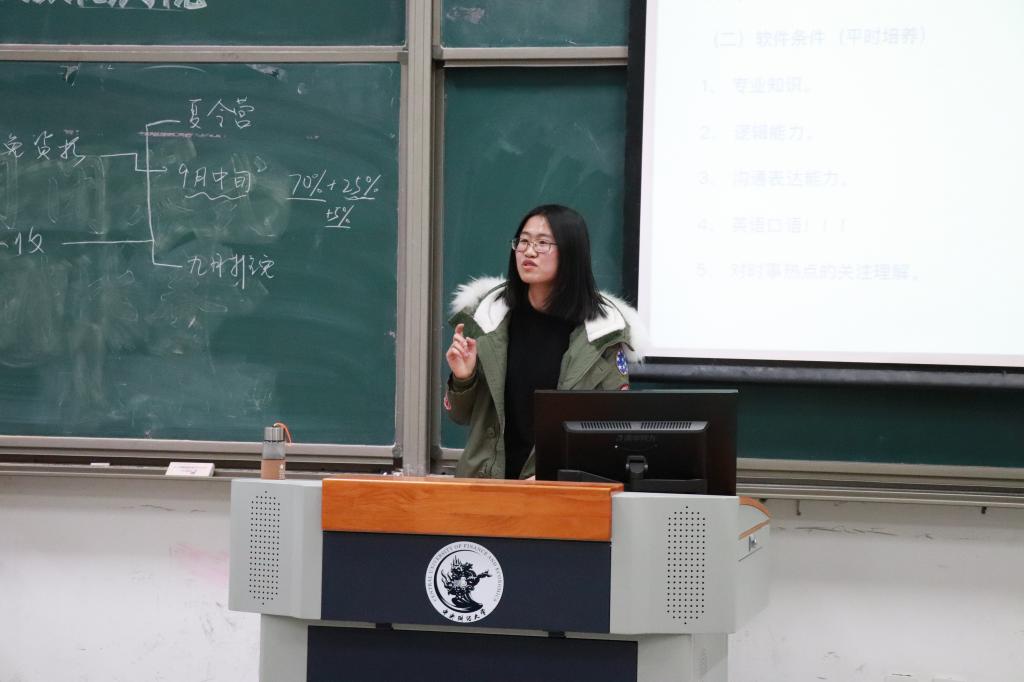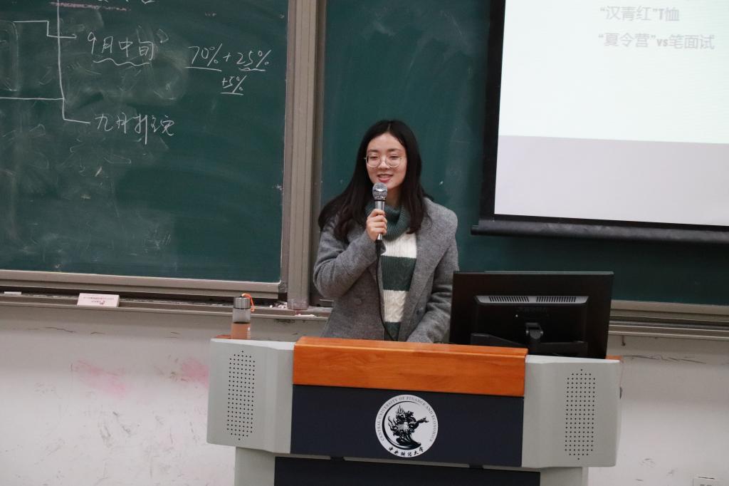 第五位是直保人大汉青金融专硕的张艳姝学姐。张艳姝学姐从课程体系、团队团队、就业和生源四个角度介绍了人大汉青金专,接下来介绍了申请流程和行程安排。学姐接下来介绍的板块是考核方式、个人体会。并给了大家在信息收集、个人定位、报名、材料准备和笔试面试准备的建议。尤其告诫大家要有计划地准备,切忌拖延。