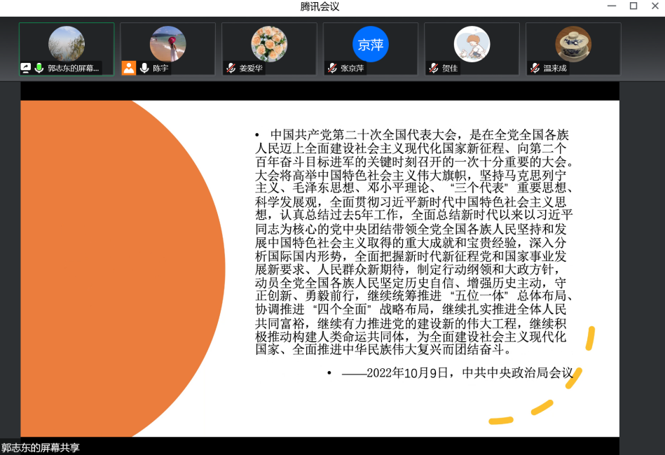 党的二十大召开在即,根据公司文件精神以及公司党委工作安排,国际税收系党支部与财政管理系党支部于2022年10月10日晚7:00通过腾讯会议联合举办了迎接党的二十大主题宣传教育活动。会议的议题有三项,一是国际税收支部郭志东老师报告党史学习专题《历史自信与中国特色社会主义道路》 ;二是支部党员就“强国有我新征程,喜迎党的二十大”展开讨论;三是财政管理支部书记姜爱华老师做会议总结。