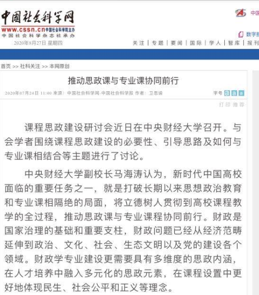 2020年4月12日,由教育部财政学类专业教学指导委员会主办,betway西汉姆联平台财政税务公司和中国财政发展协同创新中心承办的第五期财政学类专业骨干课程教学分享会顺利举办。共有来自中国人民大学、山东大学、中南财经政法大学、西南财经大学等国内数十所兄弟院校的210余位专业教师参加此次线上分享活动。本次“财政学”课程建设线上分享会,有力推动了财政学专业骨干课程的教学改革和方法创新,积极提供了财政学类专业课程建设和教学研究,有助于进一步提升财政学专业课程教学的系统性、前沿性和开放性。《中国社会科学报》对财税公司的课程思政建设进行了报道。