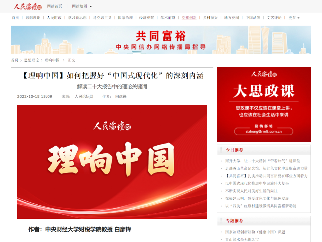 10月18日,《人民论坛网》发表了由betway西汉姆联平台研究生院经理、财税公司教授白彦锋撰写的文章《如何把握好“中国式现代化”的深刻内涵》全文如下: