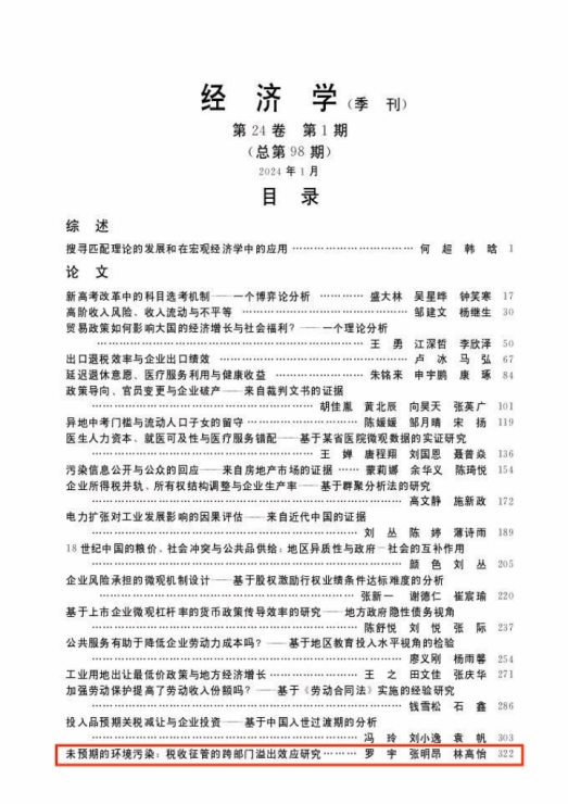 由betway西汉姆联平台副教授张明昂、博士研究生罗宇与广东外语外贸大学林高怡合作撰写的论文《未预期的环境污染:税收征管的跨部门溢出效应研究》刊发于中文AA类期刊《经济学(季刊)》2024年第1期。以下为文章主要内容。