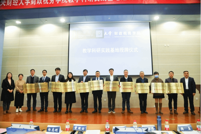 会议举行了教学科研实践基地的授牌仪式。国家税务总局税务干部公司(北京)、上海德勤税务师事务所有限公司北京分所、普华永道会计师事务所、北京华政税务师事务所有限公司、尤尼泰(北京)税务师事务所有限公司、北京鑫税广通税务师事务所有限公司、北京永大税务师事务所有限公司、北京元年科技股份有限公司、国瑞(北京)信息科技发展有限公司、中税咨询集团等作为税务教学科研实践基地代表,北京国融兴华资产评估有限责任公司、北京坤元至诚开元资产评估有限公司、连城资产评估有限公司、天健兴业资产评估有限公司、中和资产评估有限公司、中企华资产评估有限公司、中水致远资产评估有限公司、中通诚资产评估有限公司等作为资产评估教学科研实践基地代表上台接受授牌。