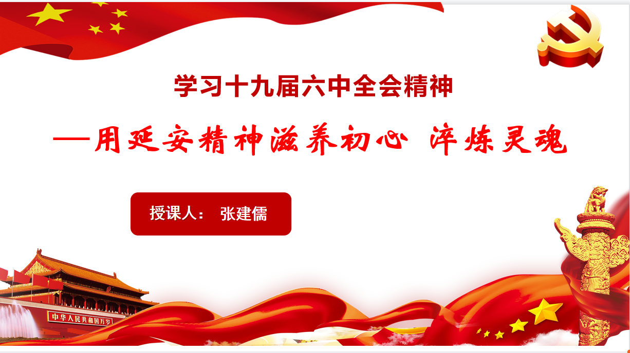 张建儒老师以“深刻理解党的十九届六中全会精神—用延安精神滋养初心、淬炼灵魂”为主题,从“党的十九届六中全会主要精神”、“延安精神的主要内容”“延安精神的时代价值”等三方面讲述了学习党的十九届六中全会精神和延安精神的重要意义和时代价值。党的十九届六中全会审议通过了两个决议,总结党的百年奋斗重大成就和历史经验,回顾百年来中国共产党践行为中国人民谋幸福、为中华民族谋复兴的初心使命所进行的奋斗、牺牲和创造,明晰“过去我们为什么能够成功、未来我们怎样才能继续成功”这一真理。张老师从延安精神的灵魂、精髓、本质和特征,深刻阐述了延安精神的主要内容,进一步提出我们要保持正确的政治方向,继承宝贵的革命精神,从新的历史条件下面临的风险和挑战看它的时代价值,保持谦虚谨慎、不骄不躁的作风,自力更生、艰苦奋斗,把延安精神存之于心、见之于行,做出无愧于时代、无愧于人民的工作业绩来。